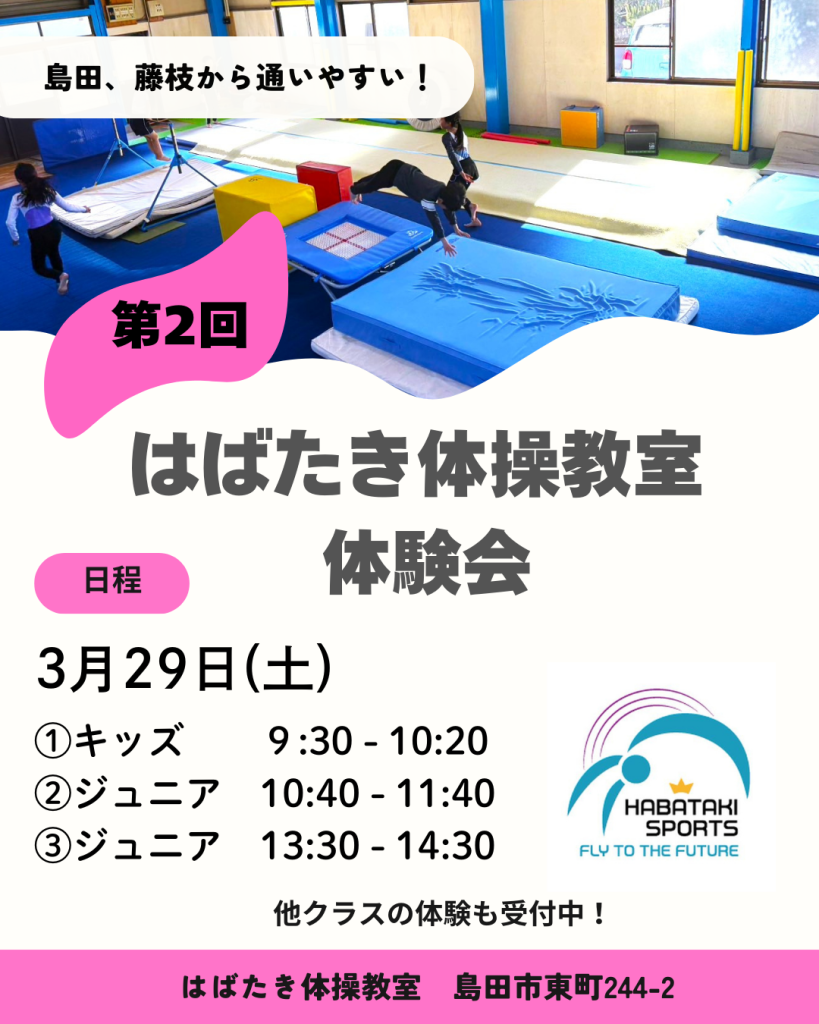 いつもはばたき体操教室にご理解ご協力ありがとうございます。 春の新しいスタートとともに、新クラスと新体制のもと、新たな挑戦を迎えます。生徒の皆様がさらに楽しく、充実した学びの場を提供できるよう、更に環境と指導内容を整えていきます。 また、... -