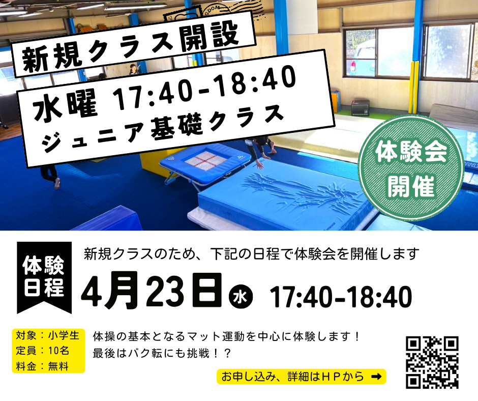 5月から『水曜日 ジュニア基礎クラス17:40-』がスタートします。 新規クラスのため体験会を開催します。 注意事項 初めから入会するつもりがない方の体験はお断りしています。 あまりにも「先生の指示が聞けない、習う姿勢ができていない」場合はレッスン... -