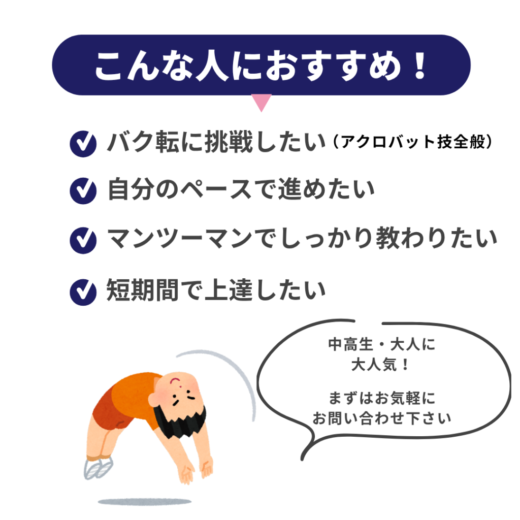 アクロバットや体操でお悩みの方は、ぜひ一度ご相談ください。